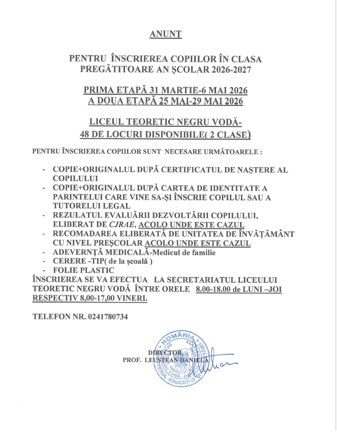 ANUNȚ ÎNSCRIEREA CLASA PREGĂTITOARE 2025-2026